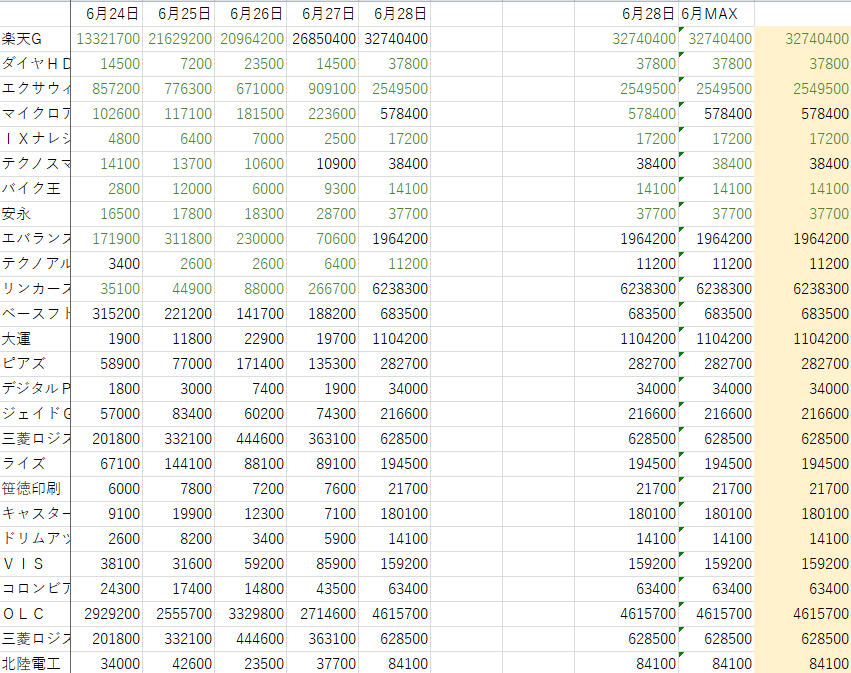 最初に出して 金曜が 6月の一番出来高多かった銘柄の中にある