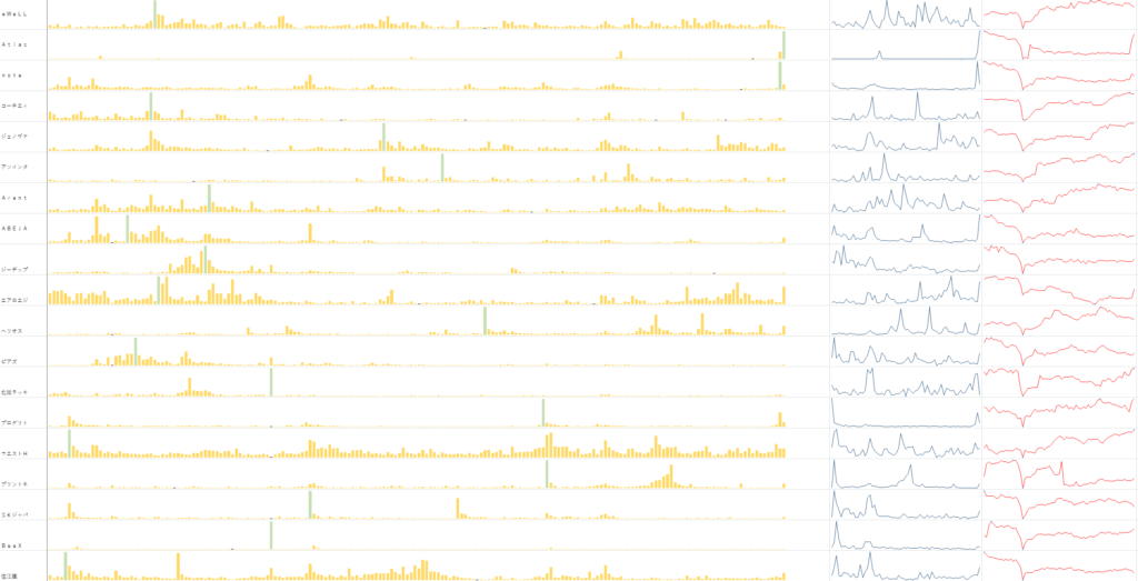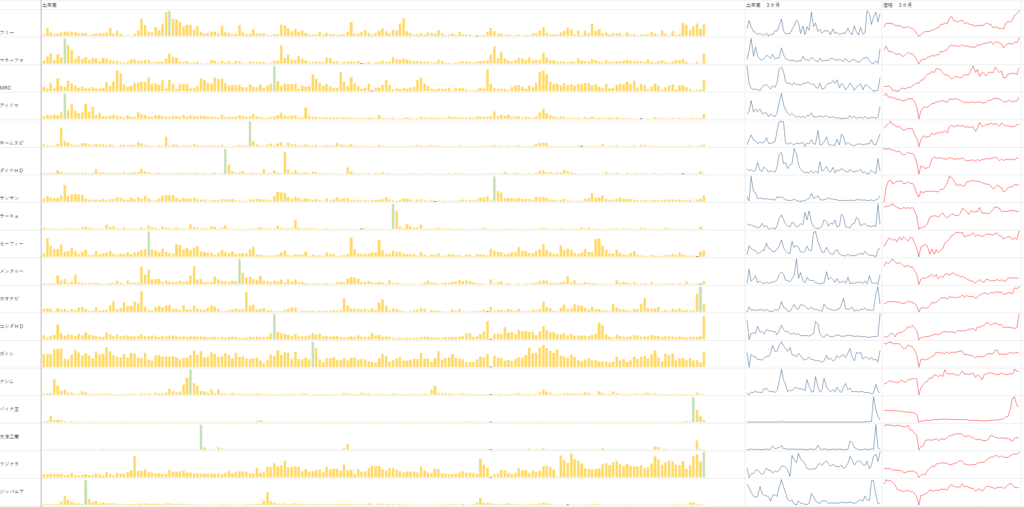 左の黄色いのは 年間の出来高 右の青いのが3か月の出来高
