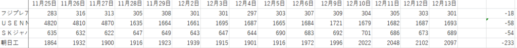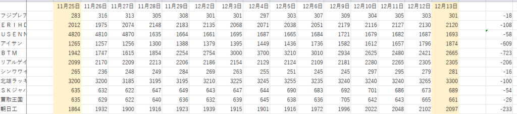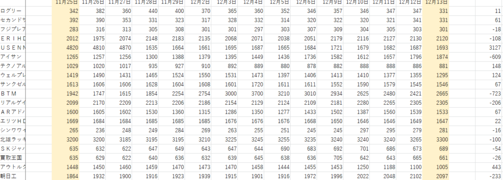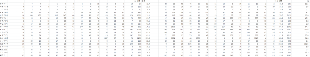 まずは 14日前と 13日の終値を比較して 削除銘柄を決める